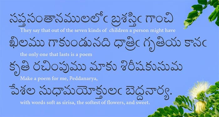 Some features of Telugu writing that present unique design challenges include the complexity of the curved outlines, and many very small counter shapes. Text in specimen is from The Story of Manu 1:14 by Allasani Peddana.