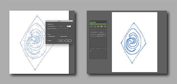 - Step 6: Depending on your personal tastes and the project’s aesthetics, you may wish to clean up your drawing a bit. You can do this by deleting extraneous pen marks and by removing unnecessary anchor points with either Simplify Path under the Illustrator Object Menu (left image below), or a third-party extension like Astute Graphics’ VectorFirstAid (right image).