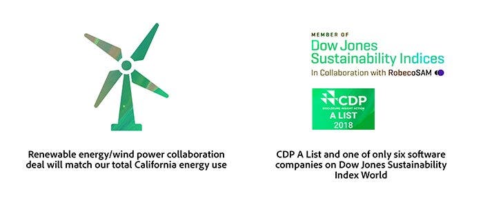 Adobe is committed to conservation and sustainability — running our business in a manner that reduces our impact on the environment. From our workspaces through our digital supply chain, we believe operational excellence and collaboration with our customers and suppliers is the way forward in meeting our RE100 goals and Science-Based Targets. This focus paved the way in 2018 to sign the first-ever renewable energy collaboration deal, procuring wind energy that will match our total California electricity use. We also partner with our digital supply chain to encourage them to adopt renewable energy goals so that we can accelerate the transition to clean energy throughout our footprint. Through this collaboration, we can achieve much more than we could alone. For the third consecutive year Adobe was one of only six software companies globally to be named to the Dow Jones Sustainability Index, and we were named to CDP’s A List, which recognizes corporate pioneers for action on climate change.