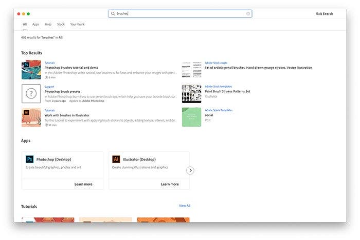 Creative Cloud membership gives you access to lots of creative resources, from apps, tutorials, forum posts, stock images, fonts, and other assets in the cloud. The new Creative Cloud desktop app comes with a powerful built-in search engine, which searches across Creative Cloud to help you find exactly what you are looking for, whenever you need it.