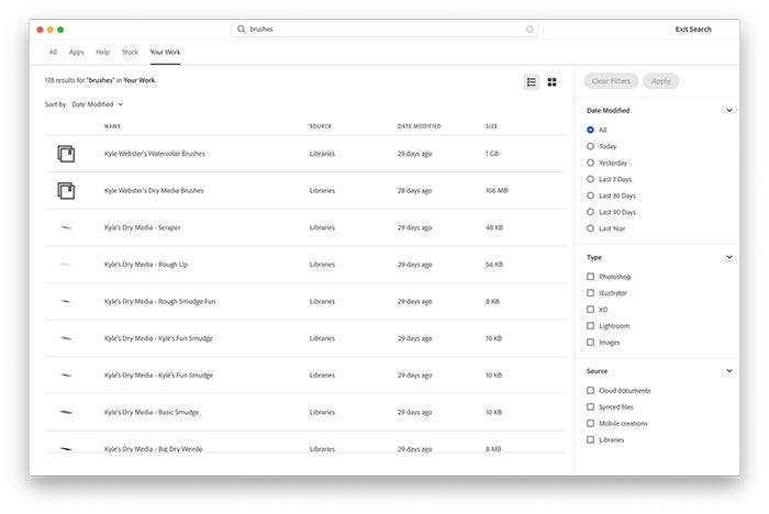 Easily find and discover assets, like Adobe Fonts or brushes, with Creative Cloud desktop’s new search functionality.