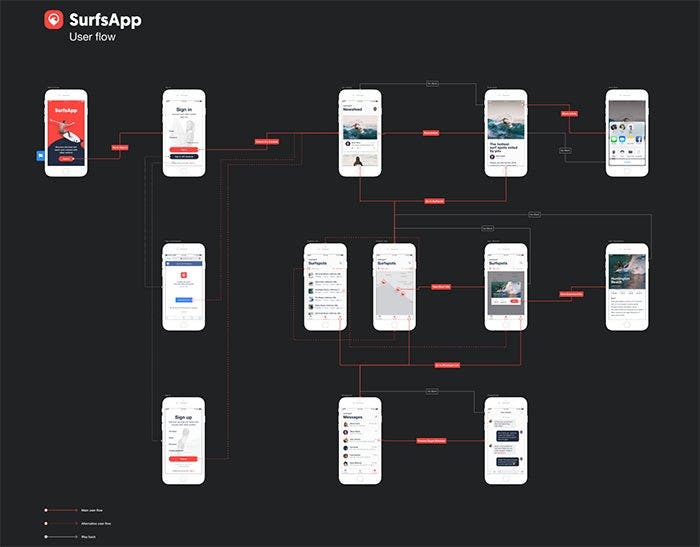 A userflow diagram for SurfsApp’s Adobe XD Prototype created using Overflow.