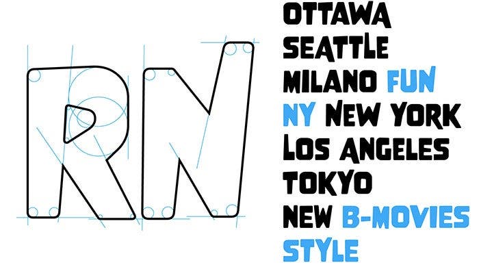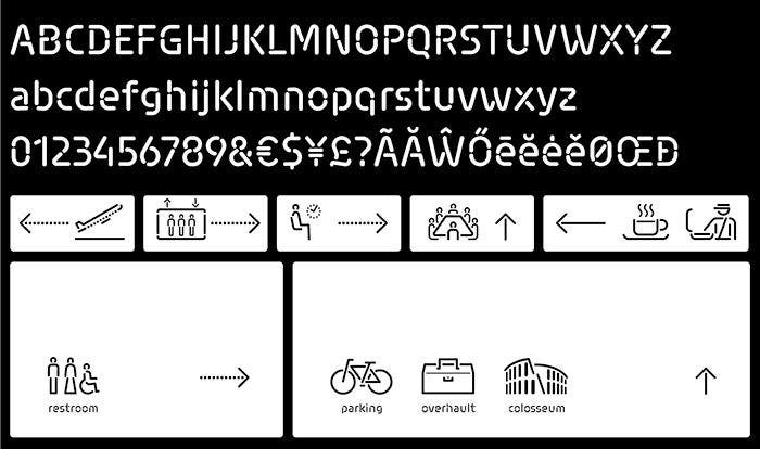 Don’t let Nove’s bouncy, joyful characters fool you. The display face, inspired by B-movie typography, was drawn according to a complex geometry. Siruca was developed for building wayfinding systems. Its stencil letters with rounded stroke endings are ideal for painting or routing in an architectural environment.