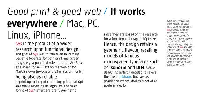 Sys was developed to work well at very small sizes. Thanks to painstaking hinting, the condensed sans serif can be used to replace TrueType system fonts. Its rounded stroke endings give it a friendly look. SysFalso — originally the corporate typeface for insurance broker YU SpA — was hand drawn on Sys’s skeleton for a more fun, casual interpretation.