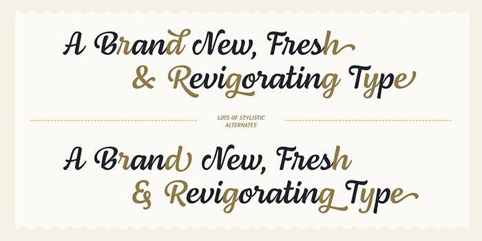 Look Script and Wreath are stylized connected scripts in multiple weights that exude a fashionably retro atmosphere. The wide all-caps serif display face Aviano Royale will make your titles and logos look regal.