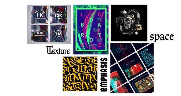 Image sources: Adobe Stock: Top left: Abstract render with spheres by Javier Pardina/Stocksy, Top middle: 3D rendering of still life with bust statue by Dmitry, Bottom middle: Futuristic Event Posters Set by Design Army, Bottom middle: Pink neon light rose sign, minimal flower concept flat lay by Zamurovic,Top right: Gel Titles by Wavebreak Media, Bottom right: 3D rendering of glass female hand by Katia. Adobe Fonts: Bottom left: Rig Solid Zero Halftone by Jamie Clarke Type, Bottom right: Bubblegum Pop Highlight by Device Fonts, Far right: Flegrei Regular by Adobe Originals.