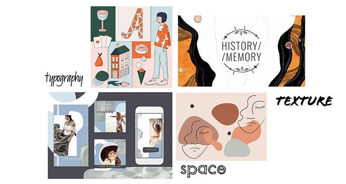 Image sources: Adobe Stock: Top left: Woman in a City by Lilly Friedberg; Bottom left: Cool Organic Instagram Story Set by You and I Graphics; Top right: History and Memory Title by M. Lomon; Bottom right: Elegant pastel illustration with linear shapes of a female face by IMR. Adobe Fonts: Top left: Kremlin Pro Regular by Paratype; Top right: Flood by Adobe Originals; Bottom right: Chelsea Market by Tart Workshop.
