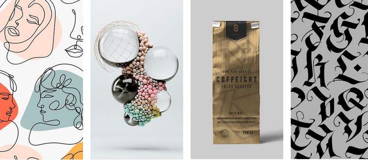 Image sources (left to right): Modern Abstract faces by Dariia; Abstract render with spheres by Javier Pardina/Stocksy; Metallic Coffee Bags Mockup by MrMockup; Handwritten Calligraphy Alphabet Set by Sergey Bitos.
