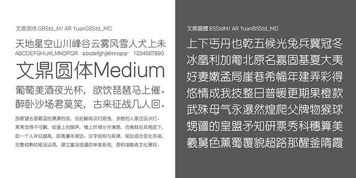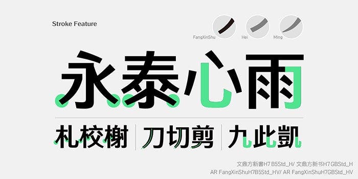 The versatile AR FangXinShu injects the elegance of Mingti into the simple and steady design of Heiti. Its contrasted, slightly tapering strokes combine the best of both worlds, offering excellent legibility in large titles as well as in small text. AR UD JingXiHei favors simplicity, abandoning traditional design concepts and reducing decoration to the minimum to achieve maximum recognizability and clearness. Smooth curves and a lack of distinguishable contrast create a comfortable and stable reading experience. The rounded AR Yuan integrates Heiti’s features such as minimalistic stroke design and large counters. Elegant and strong, it differs from traditional Mingti and Heiti for being softer and well-balanced with a serious demeanor.