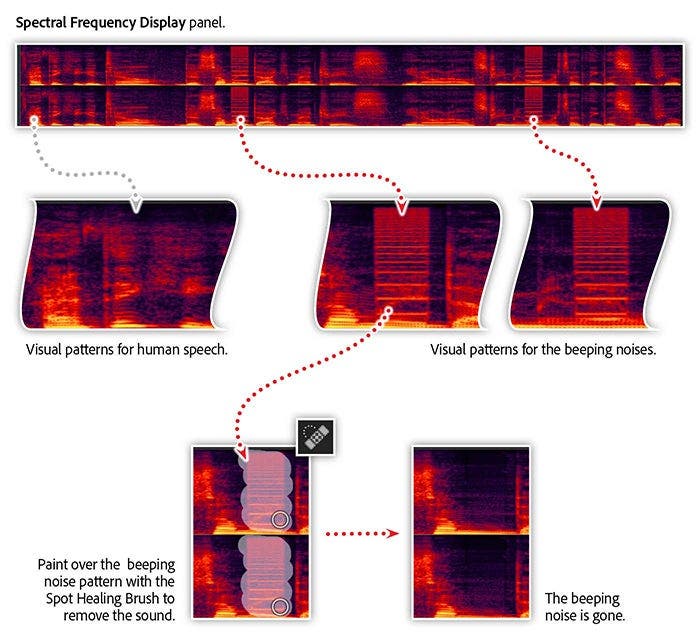 The Spot Healing Brush in Audition allows you to “paint out” the unwanted audio — just like removing a blemish from a photo in Photoshop.