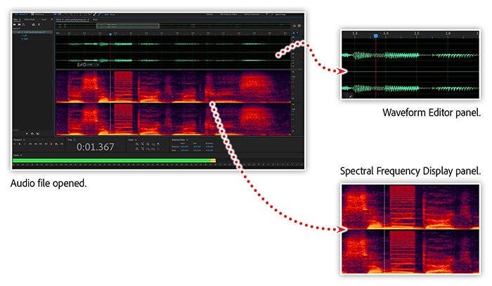 The Waveform Editor and Spectral Frequency Display panels in Audition give you a visual representation of the audible data in both your audio and video files.