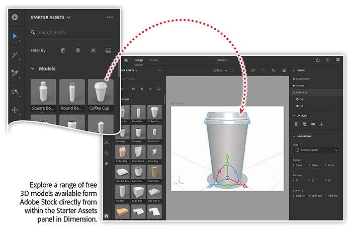 Open Dimension and choose Create New from the splash screen. Then open the Models pane in the Starter Assets panel and click the coffee cup model to add it to the scene.