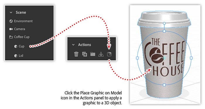Click the Folder icon for the coffee cup layer in the Scene panel. Select the cup object and click the Place Graphic on Model icon in the Actions panel. Then locate the Coffee House file from project files and click open. Scale and position the logo on the surface of the cup so it looks just right.
