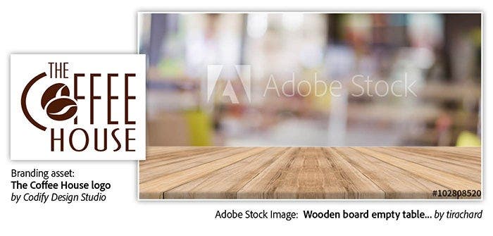 Right image: Wooden board empty table… — by tirachard, left logo: The Coffee House logo — by Codify Design Studio.