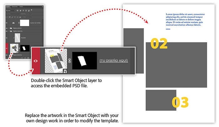 This template contains three Smart Objects that are mapped to pages in the magazine image. Open the template in Photoshop, locate the Layers panel, and locate the middle layer group named Página derecha (i.e., Right page). Then open the Smart Object named Tu disneño aquí (i.e., Your design here).