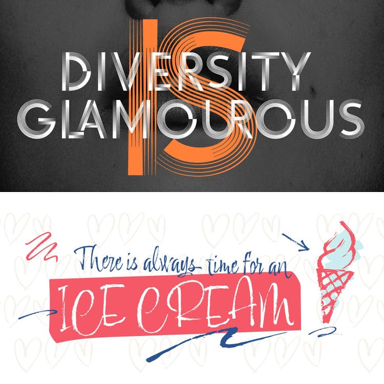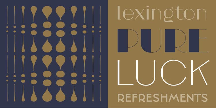 Resistenza is back with the friendly and energetic textured script Adore You. The calligraphic serif face Turquoise adds elegance to titles and headlines, and includes an inline variant. Royale is a monoline ornamental serif face that would lend high-end food and cosmetics packaging vintage flair. Voguing and DreamTeam introduce an inventive striped texture to a geometric all-caps sans serif and a straight-sided display sans, respectively.