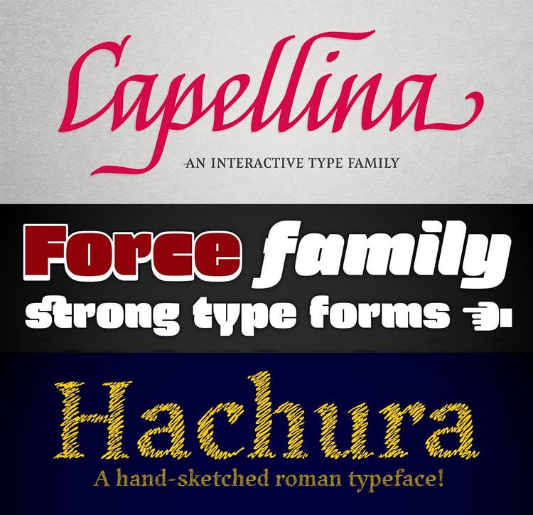 From the hand-scribbled serif face Hachura to the powerful, dark square sans serif Force and the calligraphic script Capellina (which comes in smooth and rough finishes), Outras Fontes has display styles for everyone.