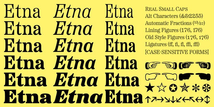 Inspired by the Aetna wood type style of the late 19th century, Mark Simonson’s Etna tames this quirky Victorian design into a family of six weights with matching italic and condensed styles suitable for contemporary use.