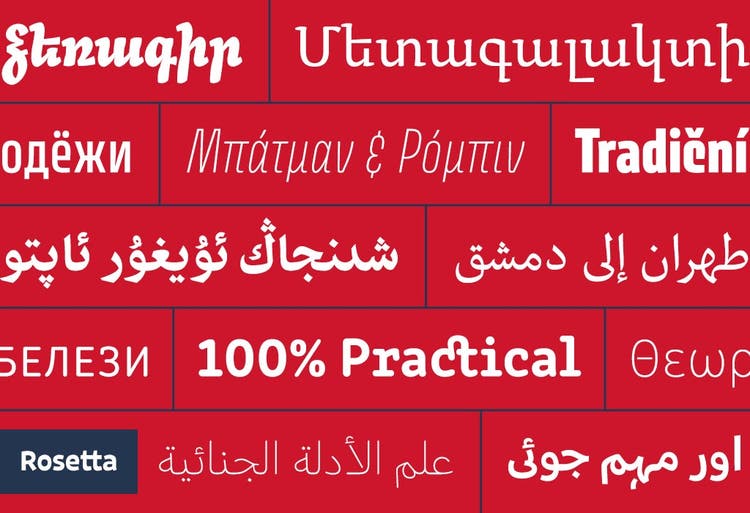 Rosetta Type Foundry addresses the needs of global typography by collaborating with native type designers to create innovative fonts for a polyphonic world. The sturdy text face Arek now has a counterpart for Armenian, an underserved script. The pan-European (PE) families Clone Rounded PE, Avory I PE, and Skolar Sans PE support all Cyrillic-script, Latin-script, and Greek languages. Skolar Sans is also available in Gujarati and Arabic now, and the affable Nassim Arabic was designed from the outset as an Arabic-Latin family.