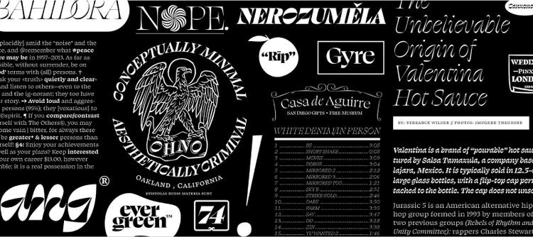 Short of using actual curse words, OH no Type Co.’s superb serif siblings Swear Text and Swear Display can only be described as frickin’ fantastic. With decisive letterforms and exaggerated razor-sharp serifs, these iconoclasts are guaranteed to turn heads. Wait until you discover the reversed-stress Citali styles — they are preposterous(ly good)!