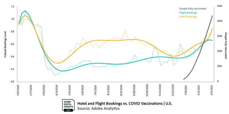Adobe is also seeing regional differences, with consumers in the northeast more hesitant to travel. Bookings in March originating from the northeast are at 56 percent of pre-pandemic levels in Jan 2020 (West 63 percent — South 70 percent — Midwest 75 percent). However, the northeast sees a 3.2 percent increase in flight bookings for every 1 percent increase in vaccinations, the highest of any region.