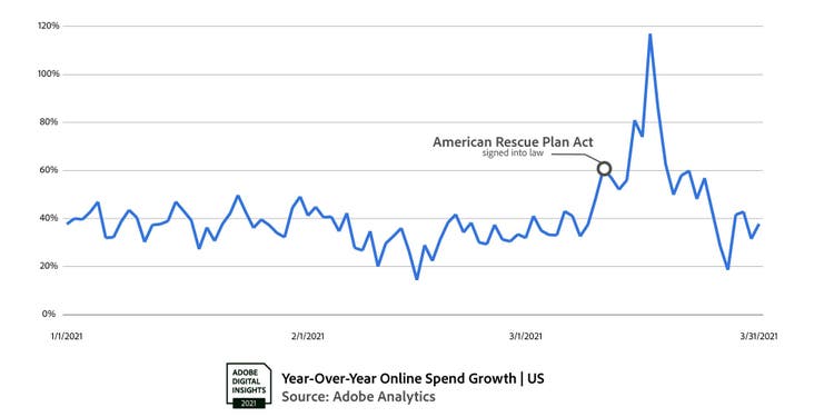 e-commerce broke records in March 2021, with Black Friday-levels of online spend. Beginning March 11, when the American Rescue Plan was signed into law, e-commerce began to surge. An extra $8 billion was spent in the 3-week period from Mar 11–Mar 31 (for comparison, Black Friday 2020 drove $9 billion in e-commerce).