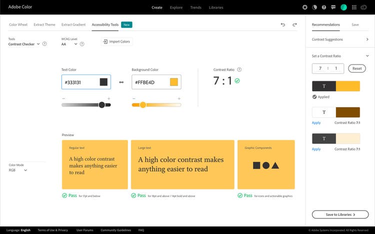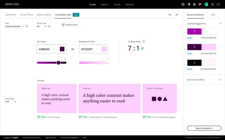 Contrast Checker is Adobe Color’s new accessibility tool for creating WCAG compliant color themes based on an advanced recommendation system. The contrast-checked color palettes can easily be shared through Adobe Creative Cloud Libraries and can be readily accessed within any Creative Cloud apps. Simply put, Contrast Checker enables you to dynamically fix color legibility of your designs, and meet WCAG criterion.