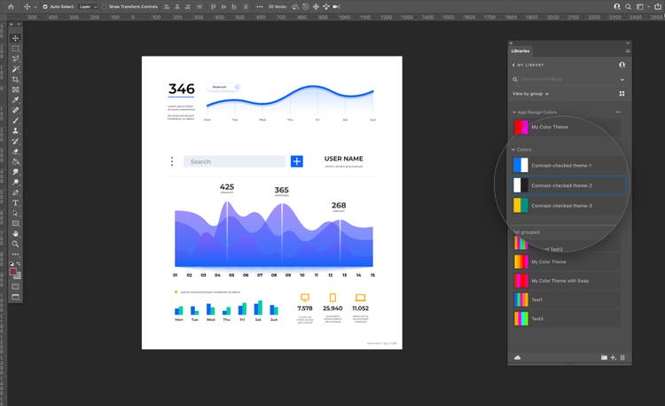 To make the experience more seamless, the two-color themes will then be saved as an asset within Libraries that help to organize, use, and share re-usable creative elements within your favorite Creative Cloud applications. This allows the user to update the colors in their designs without the hustle of any back and forth to copy or remember color values.