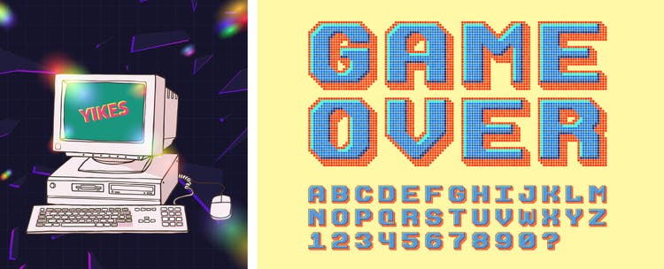 Pixel-art and pixelated text are common visual cues of Vintage Vaporwave, along with heavy outlines, isometric shapes, extruded lettering, grids and dots, and strong, graphic shadows. Designers are often deploying those shadows and outlines to add depth to otherwise very flat compositions, to suggest 3D space, and to create digital stickers.