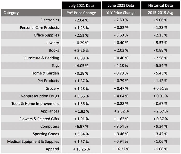 Consider that as a historical benchmark, from 2015 to 2019, online prices fell 3.9 percent on average each year — highlighting the reversal in predictable eCommerce trends that has sustained in recent months. For further reference, the Consumer Price Index (CPI) which captures offline prices, rose 5.4 percent YoY and 0.5 percent MoM in the month of July 2021.