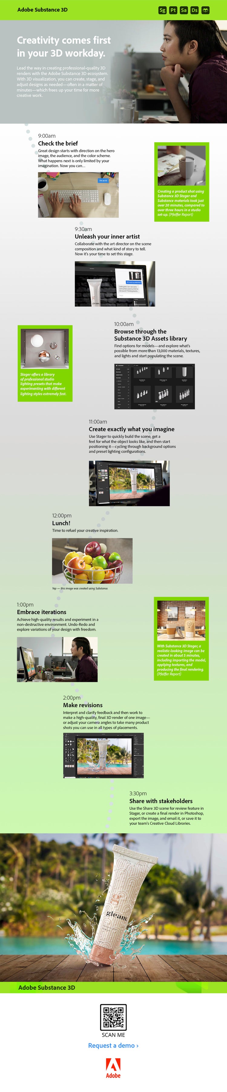 Tools like the Substance 3D Collection make the job of iterating on an image so much easier. You can rotate images and arrive at the right concept much faster: just place the product in the scene, change the lighting, and deliver five images within an hour. It’s massively shortened the timeline of creating 3D images.