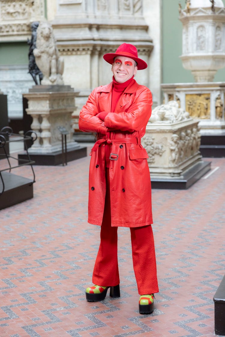 Luca Bosani is a multimedia artist, specialising in wearable and performance art. They developed a concept of Unidentified Performing Objects (UPO) to break down binary categorisation. These are pieces that blur the line between costume, prop and artistic output used in performances. Their practice focuses on breaking down barriers and labels through display and performance, posing questions such as: “When does a costume become a painting?” or “When does a shoe become a sculpture?”