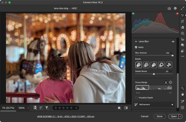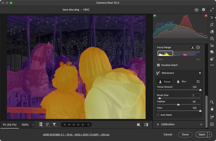 There are two brush-based tools available here: Focus and Blur. Selecting Focus and brushing on a part of the photo that was blurred by Lens Blur will update the depth map to bring the brushed area within the current Focus Range. Brushing with Blur will cause the depth values in the brushed area to match the background depth in that part of the photo. Both the Focus and Blur brushes also support our usual brush options: size, feather, flow, and Auto Mask. Turning on the Visualize Depth option will give a more direct view of how the depth map changes when these tools are used.