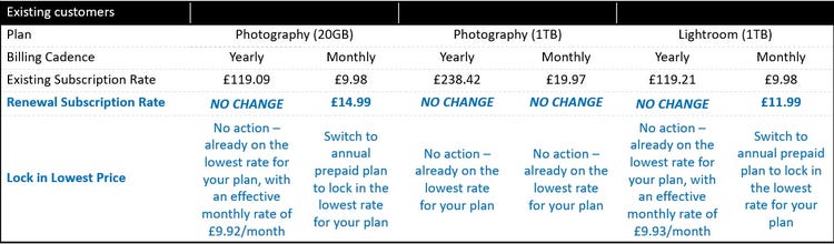 Photography Plan (20GB) — The pre-paid annual plan remains unchanged at £119.09/year (equivalent to £9.92/month). Monthly billing remains an option for existing members with an updated price of £14.99/month, with an annual commitment, effective at your next renewal. Existing members who pay monthly can switch to the pre-paid annual plan to pay the equivalent of £9.92/month. We will continue to support this plan for existing customers, however this plan will no longer be available to new customers.