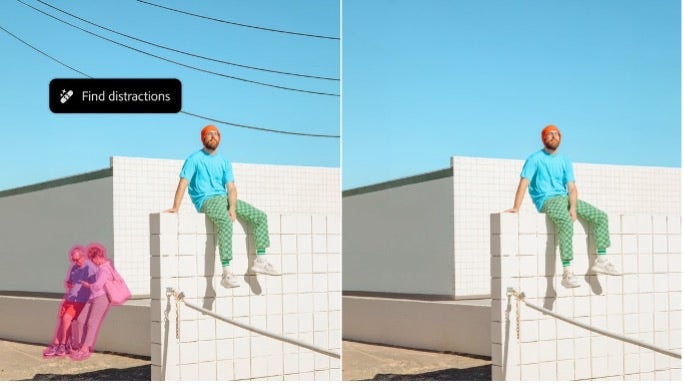 Nous avons ajouté la fonctionnalité Suppression des éléments indésirables dans l’outil Supprimer, ce qui vous permet d’éliminer les éléments superflus d’une photo, comme des touristes à l’arrière-plan ou des lignes électriques qui gâchent le paysage. Cette fonctionnalité détecte et supprime automatiquement les câbles et les intrus sur les images, et remplace l’arrière-plan par du contenu généré.