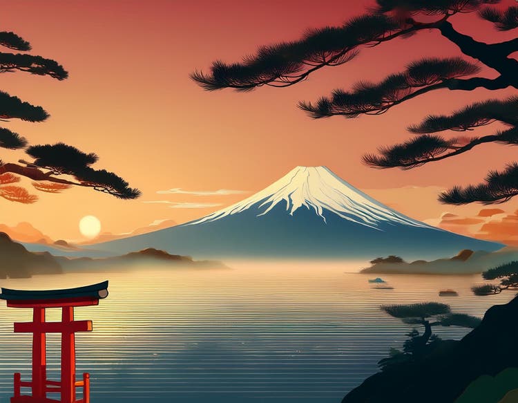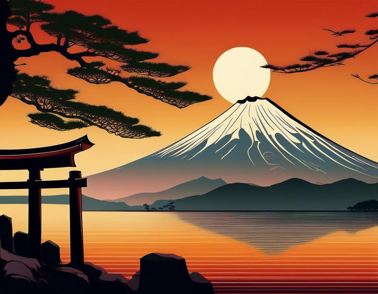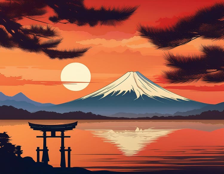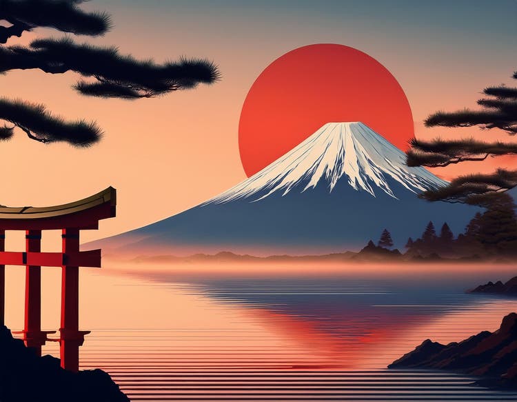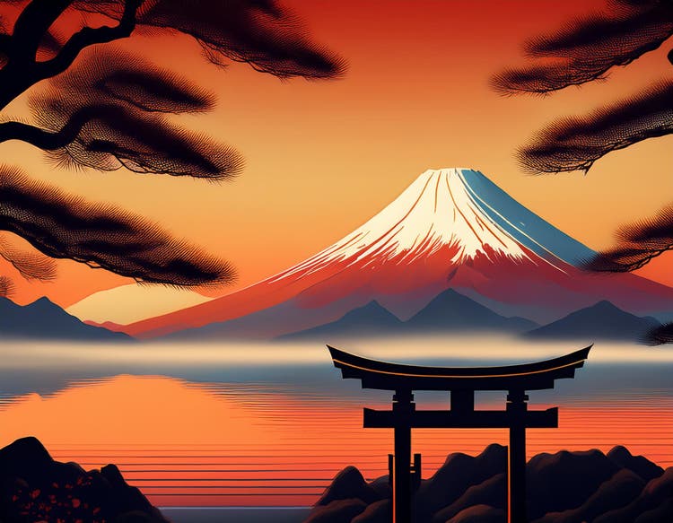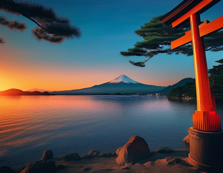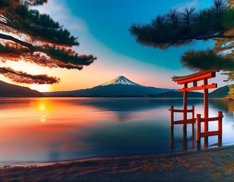 構図をもう少し意図的なものにしたいので、更にプロンプトを変更します。先ほどのプロンプトに少し具体的なレイアウト指定を加えて、「初日の出、富士山、芦ノ湖、一基の鳥居、画面の端に松」と入力し、生成してみます。