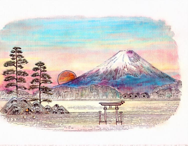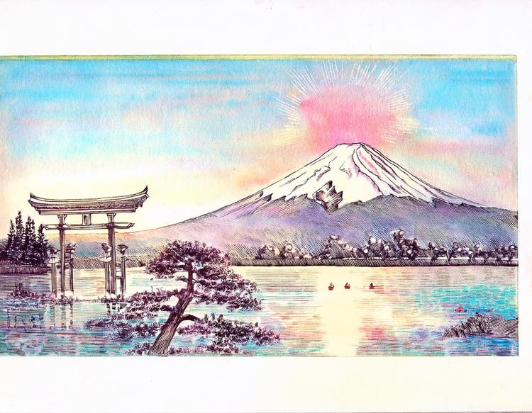 プロンプトに「浮世絵」を追加したらどうなるのか気になったので、プロンプトを「初日の出、富士山、芦ノ湖、一基の鳥居、画面の端に松、浮世絵」にして、実際に生成してみました。構成参照のラフ絵はそのまま利用しています。古い温泉街で売られていそうな絵葉書を思い出させる、浮世絵風の仕上がりになりました!これはなかなかいい感じです。
