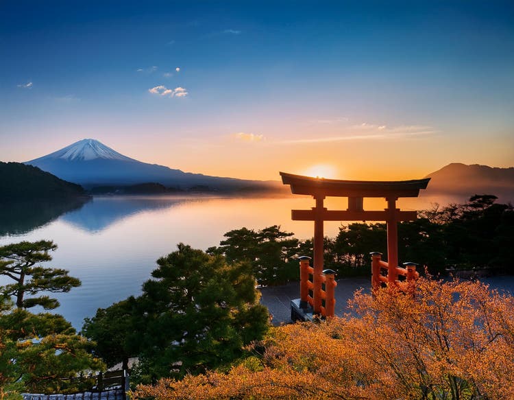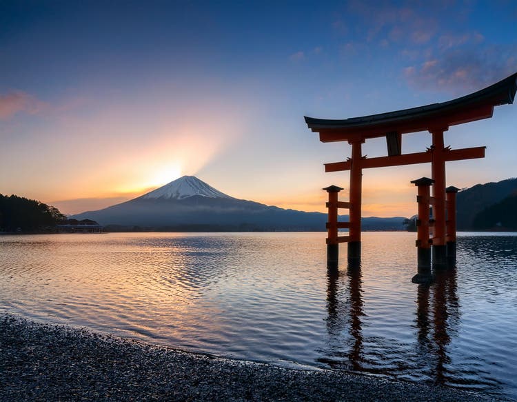 ということで、日本の正月らしさがある画像が欲しいと Firefly に伝えるべく、プロンプトに新たな情報として「富士山、芦ノ湖、鳥居」を追加してみます。また、山の裾野を広く見せたいので、縦横比を 4:3 に変更します。すると、以下の画像が生成されました。