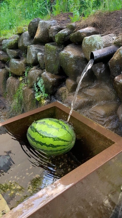 奥の描写がちょっとふんわりしているものの、山奥の冷たい清流に浮かぶスイカになりました。