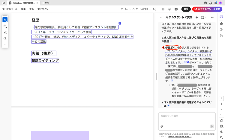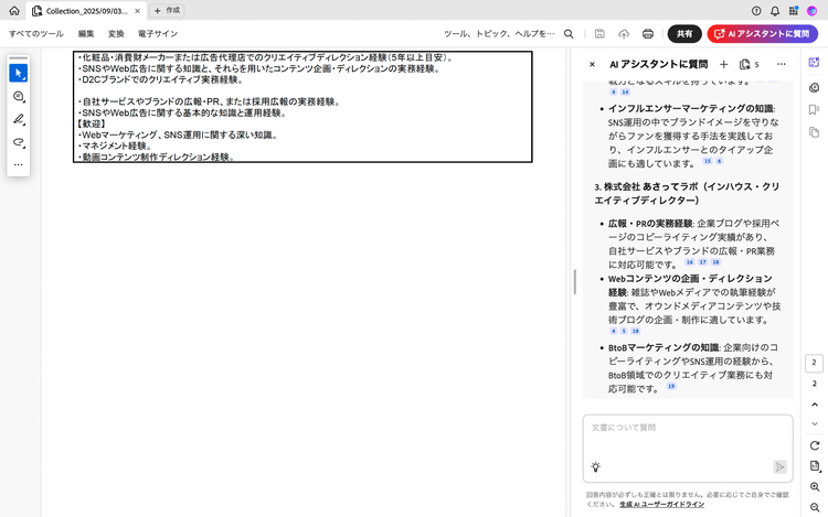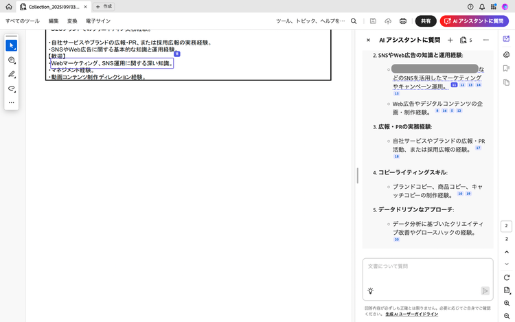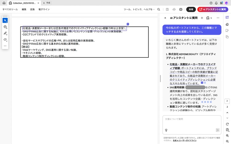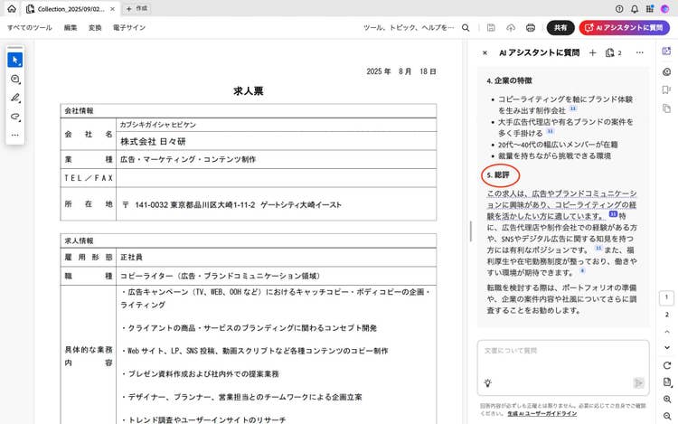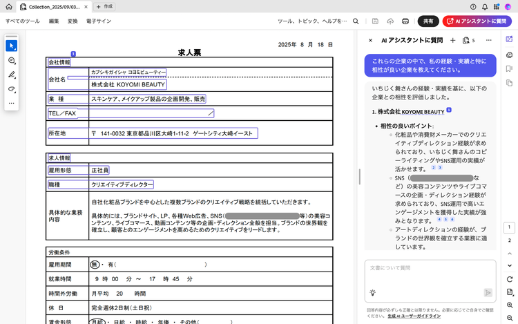 まずは現在のスキル・経験と親和性が高い職として、業務経験のあるコピーライター職のPDF形式の求人票*をAdobe Acrobatで開きます。
