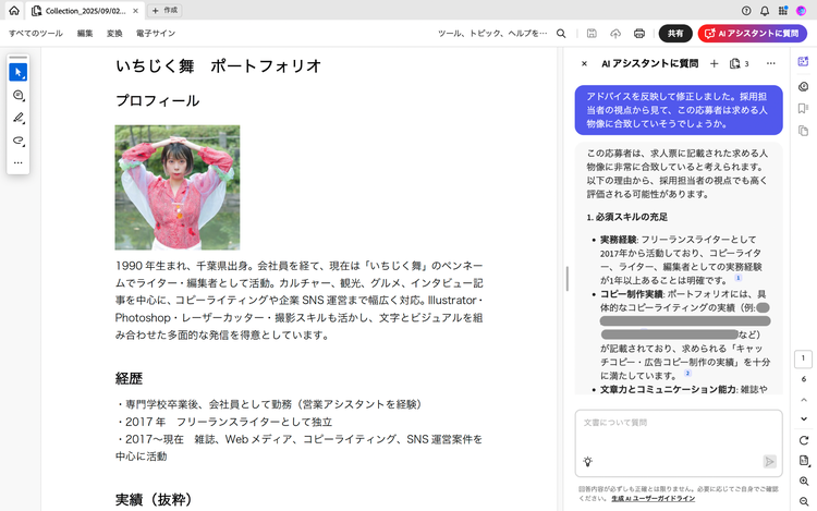 「AI アシスタントに質問」の右隣にある「+」をクリックし、ポートフォリオをアップロードします。読み込みが完了したら、「求人票に合わせた自己アピール文の修正ポイントや、採用担当者に響く改善アイデアを提示してください」とリクエストします。