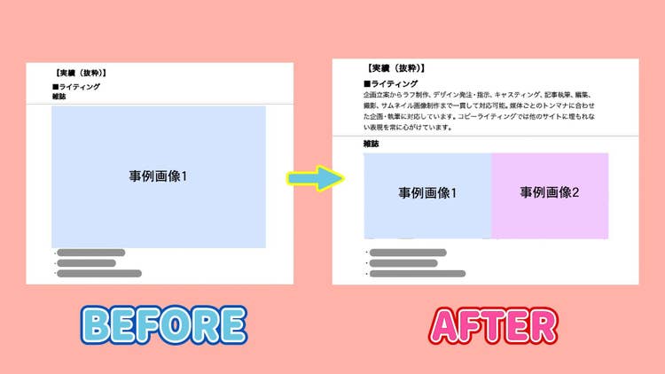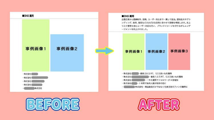 「さまざまな媒体でのコピー制作実績を掲載する、視覚的に魅力的なレイアウトにする」といったデザインに関するアドバイスもありました。事例画像のキャプチャを貼り付けただけのものから、複数の事例が一目で確認できるようにレイアウトを整理します。