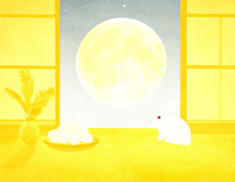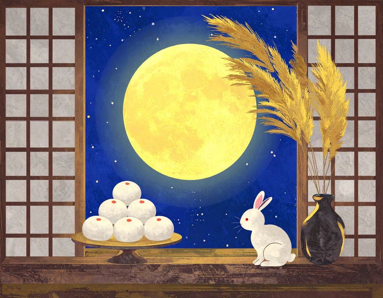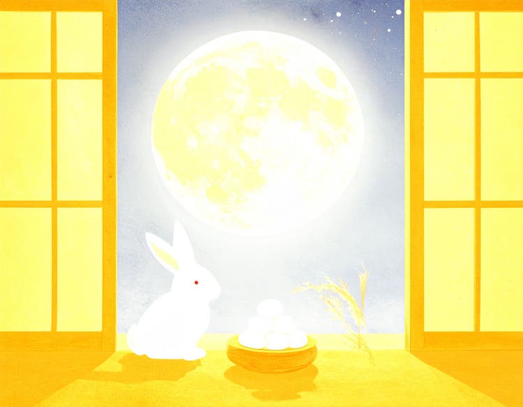 左は、団子を眺めているウサギの表情がかわいらしく、絵本の挿絵のようです。右は、団子がまんまるでかなり月見団子に近いものが生成されました。満月に山がかかってしまったのが残念です。