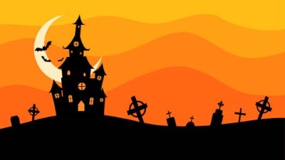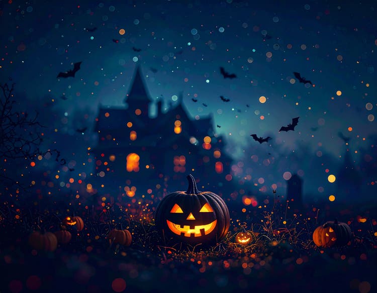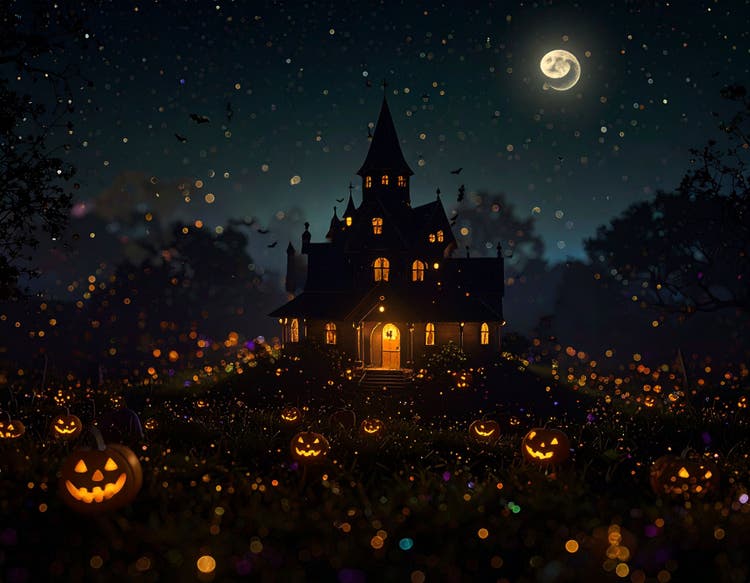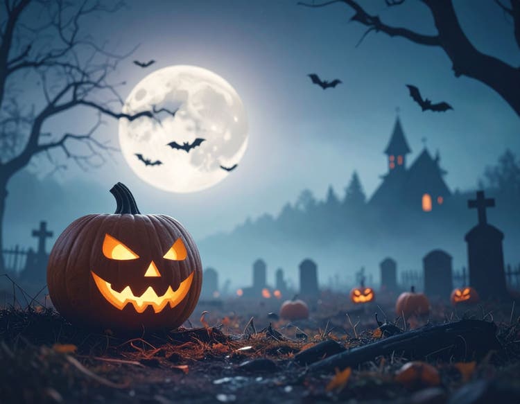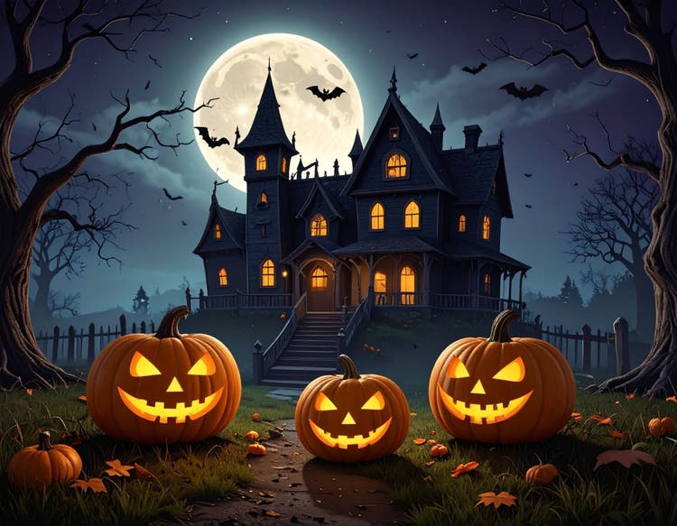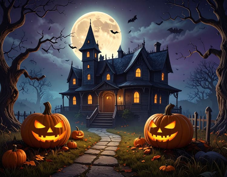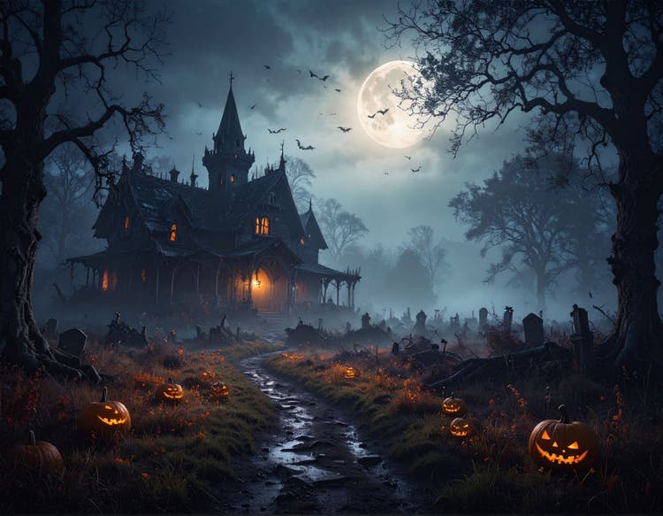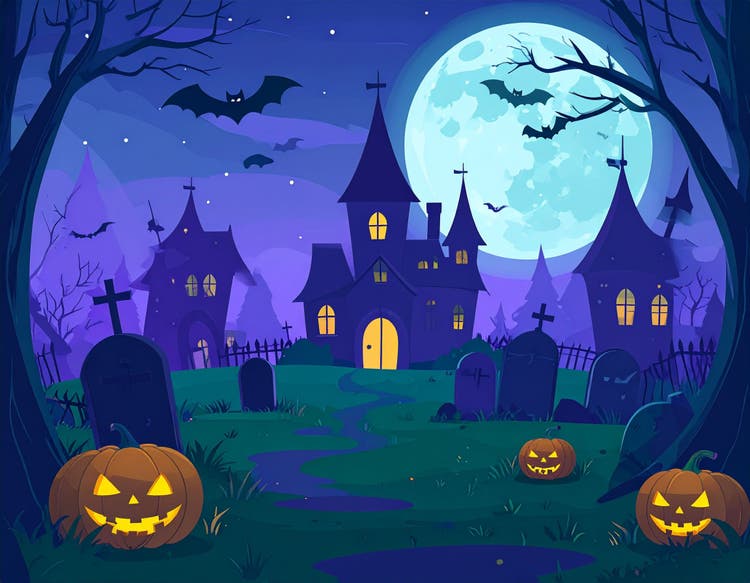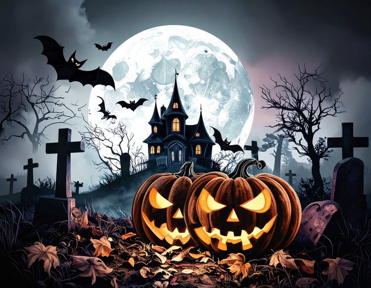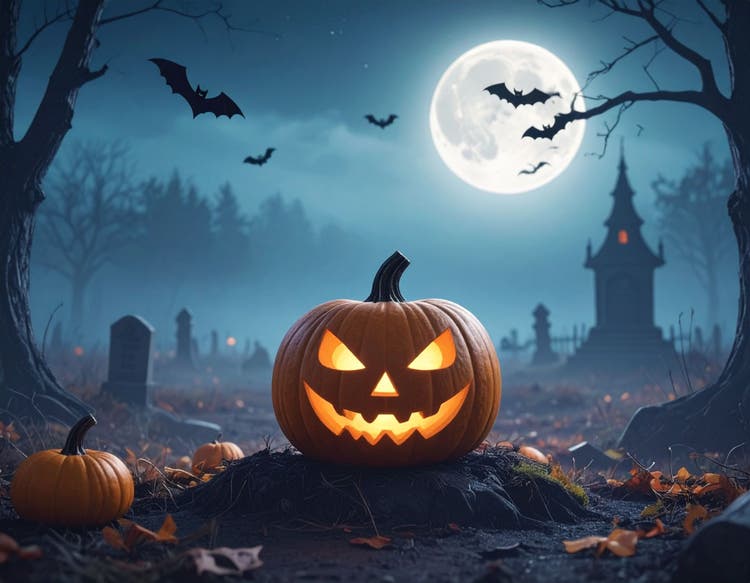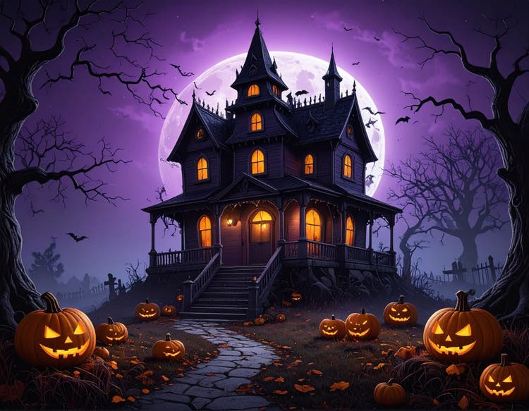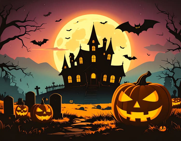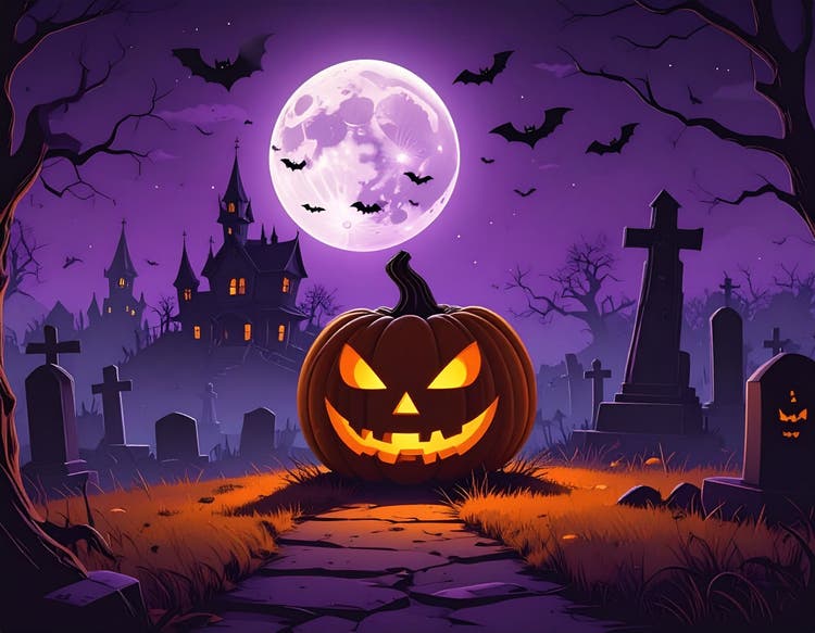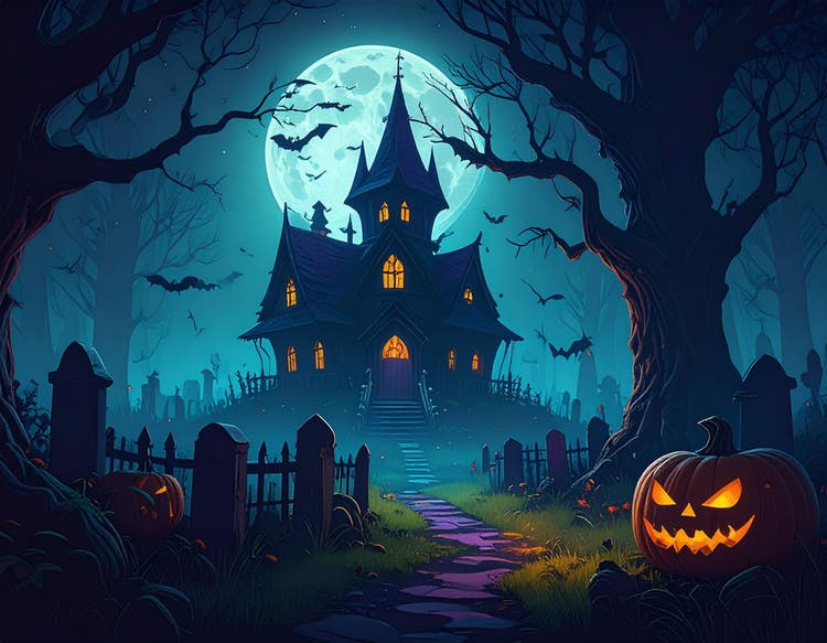 生成画像の構図にあまり変化が見られないようですのでプロンプトを変えてみます。新しいプロンプトは、「ハロウィンの夜、荒れ果てた墓場とホーンテッドハウス、満月。オレンジと紫の光に包まれた不気味なジャック・オー・ランタン。コウモリ達が不気味に飛び回る。」です。