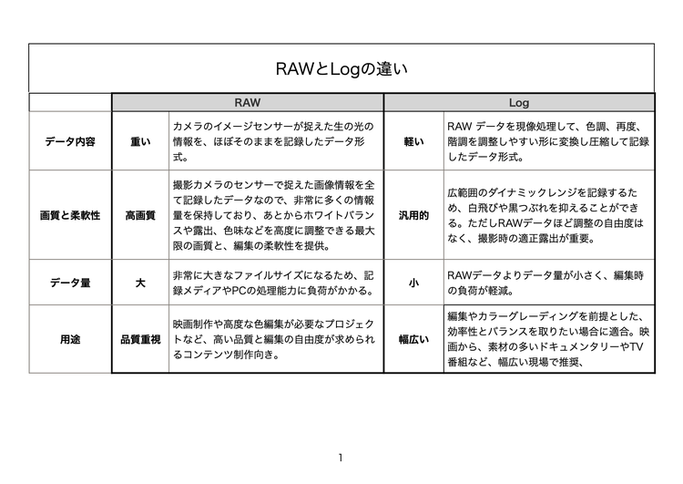 Logは生のRAWデータから色調・彩度・諧調を処理し、データ量を圧縮した編集前提の記録形式したもので、RAWはセンサーの生データをほぼそのまま保存したデータなので、最も高品質で編集の自由度が高いです。Logはデータ容量を抑えつつ広いダイナミックレンジを確保し、カラーグレーディングによる画作りを可能にしますが、RAWは撮影後のホワイトバランスや露出など、より広範な編集調整が可能なデータです。