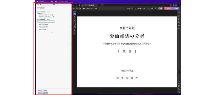 あるいは「どんな単語で検索すればいいかわからない」といった場合は、Acrobat AI アシスタントに検索候補になりそうな単語をたずねてみるのもよし。重要なキーワードを押さえておけば、資料の中で注目すべきポイントも見つけやすく、勘所を逃しません。