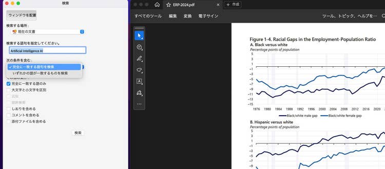 今回は2024年度大統領経済報告書(Economic Report of the President)を例に、「AI」という単語がどういった場面で登場したかを調べてみます。しかし、「AI」ではなく「artificial intelligence」と表現されている場面もあり、正式名称と略称が混在している状況です。