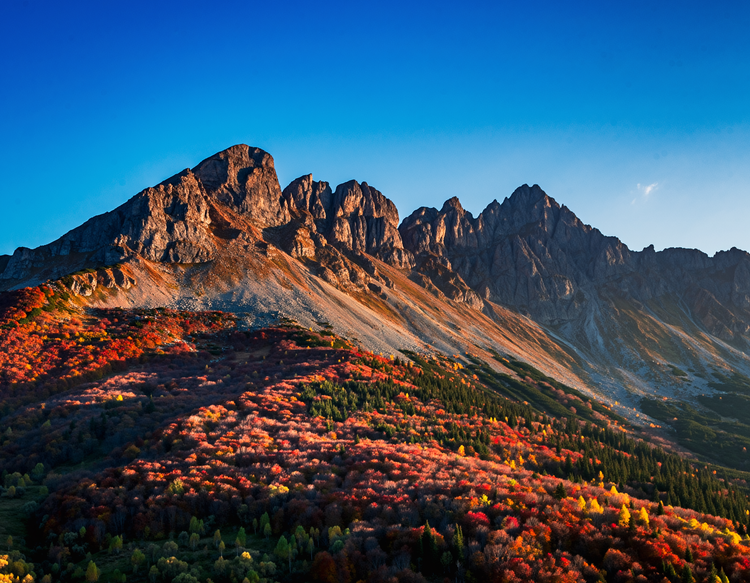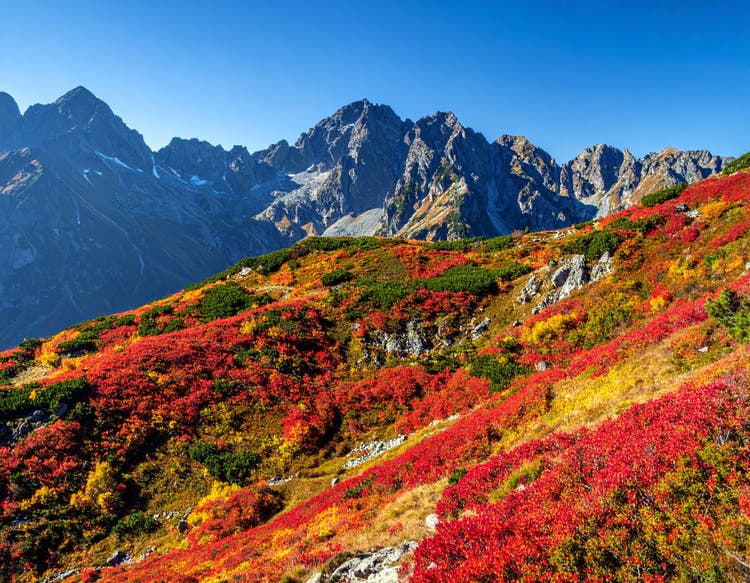 最後に風景写真も生成してみます。プロンプトは「秋の山地の風景。澄み切った青空の下、鋭い岩峰が連なる山々。山肌には赤やオレンジ、黄色の紅葉が広がっている。高山植物と岩肌の質感がリアルに描かれた、鮮やかな風景写真。」です。