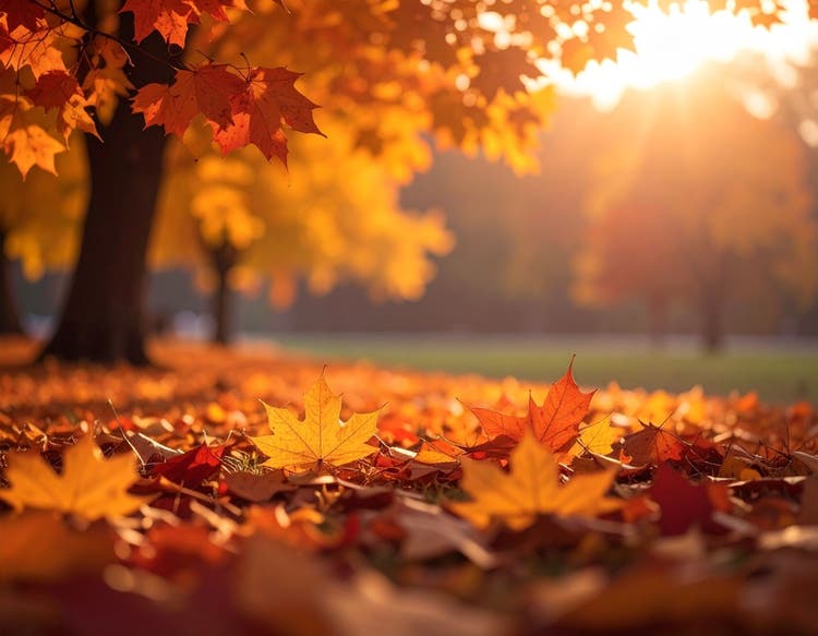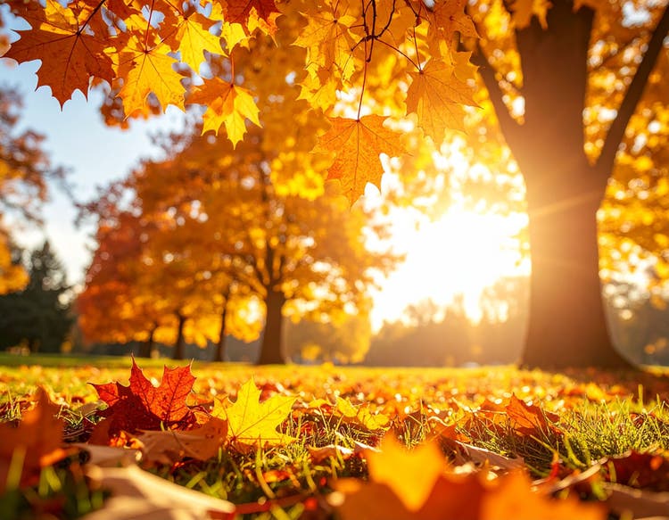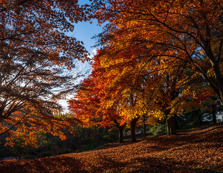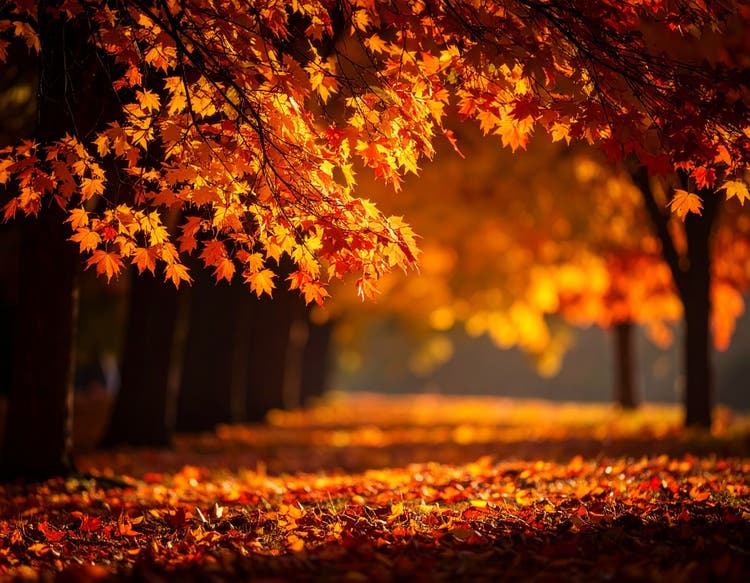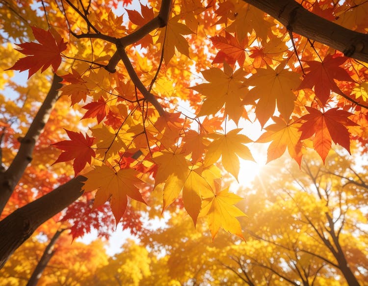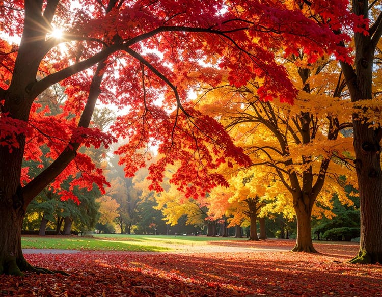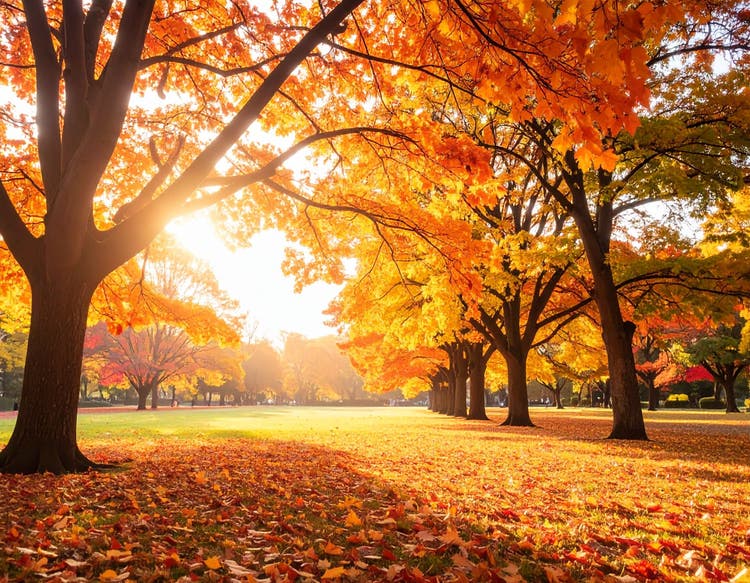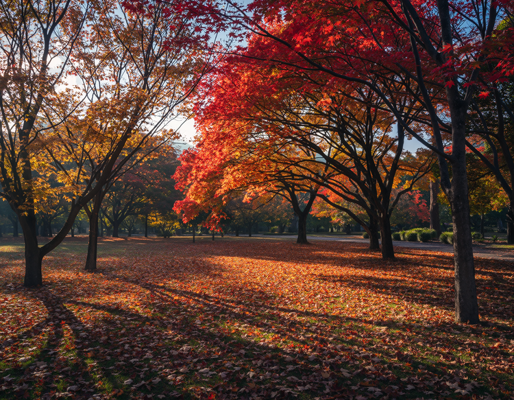 プロンプトの色指定では生成結果に大きな違いが表れなかったので、紅葉に日光が当たるようにプロンプトを変えてみます。次のプロンプトは「赤やオレンジ、黄色の紅葉したカエデの木々が広がる秋の公園。地面には落ち葉が一面に積もり、やわらかな日差しが枝の間から差し込む穏やかな風景。」です。