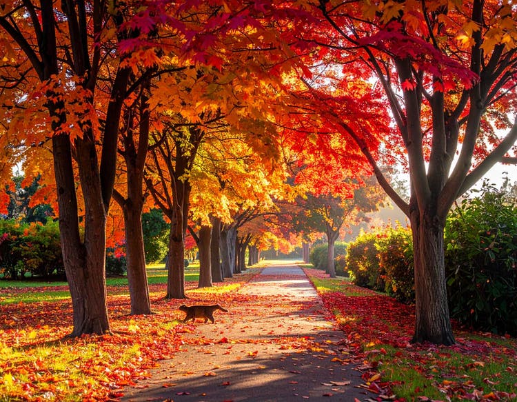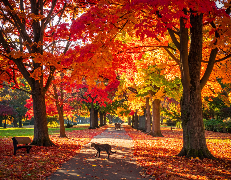 比較のため、Image 4 の「構成参照」と「スタイル参照」の両方に上の画像 ↑ を参照させて生成した例も紹介します。Image 4 も Image 5 も、プロンプトは「赤やオレンジ、黄色の紅葉したカエデの木々が広がる秋の公園。猫が一匹歩いている」です。
